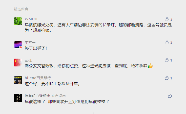 滥用远光灯行为被广大驾驶员所厌恶,纷纷留言表达支持治理。