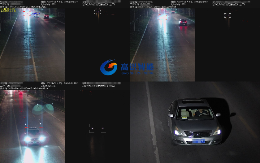 系统在据检测点180米以上、60-80米、30-50米、20-30米四个位置共抓拍4张图片,结合以上四个位置的车灯开关状态的持续跟踪与检测,符合违法使用远光灯系统的,进行期间远光灯持续使用过程录像储存,并将抓拍的四张图片合成一张四合一图片。同时进行车牌号码分析储存记录。并在最终阶段合成叠加到图片中。