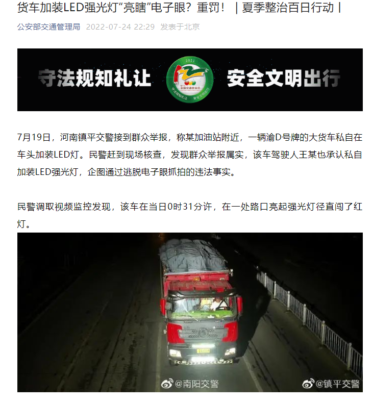 据镇平交警、河南交警、公安部交通管理局官方微信公众号报道,7月19日,镇平县公安局交警大队接到群众举报称:在县建设大道与玉神路交叉口东100米加油站处,一辆号牌为渝DL***3大货车私自在车头加装LED灯,存在交通违法嫌疑,镇平交警立即赶赴现场。