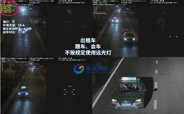高识智能远光灯抓拍系统,采用实时跟踪判别技术,在四个位移位置抓拍四张车辆图片,并实时持续分析其灯光使用状态,对持续恶意使用远光灯行为进行抓拍,仅为示警或照明作用,短暂使用远光灯不抓拍。