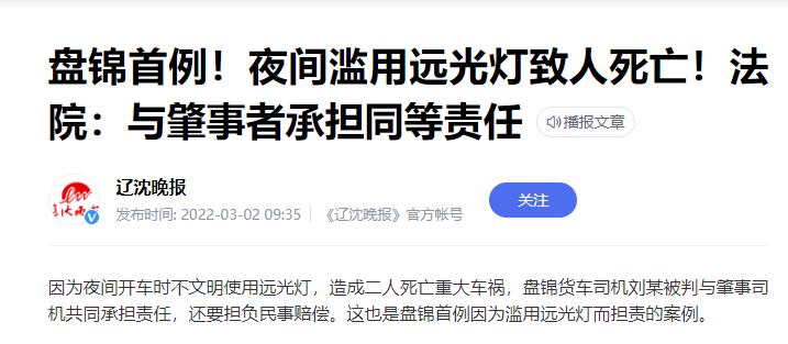 近期,多地出现因滥用远光灯造成事故被定责的案例。