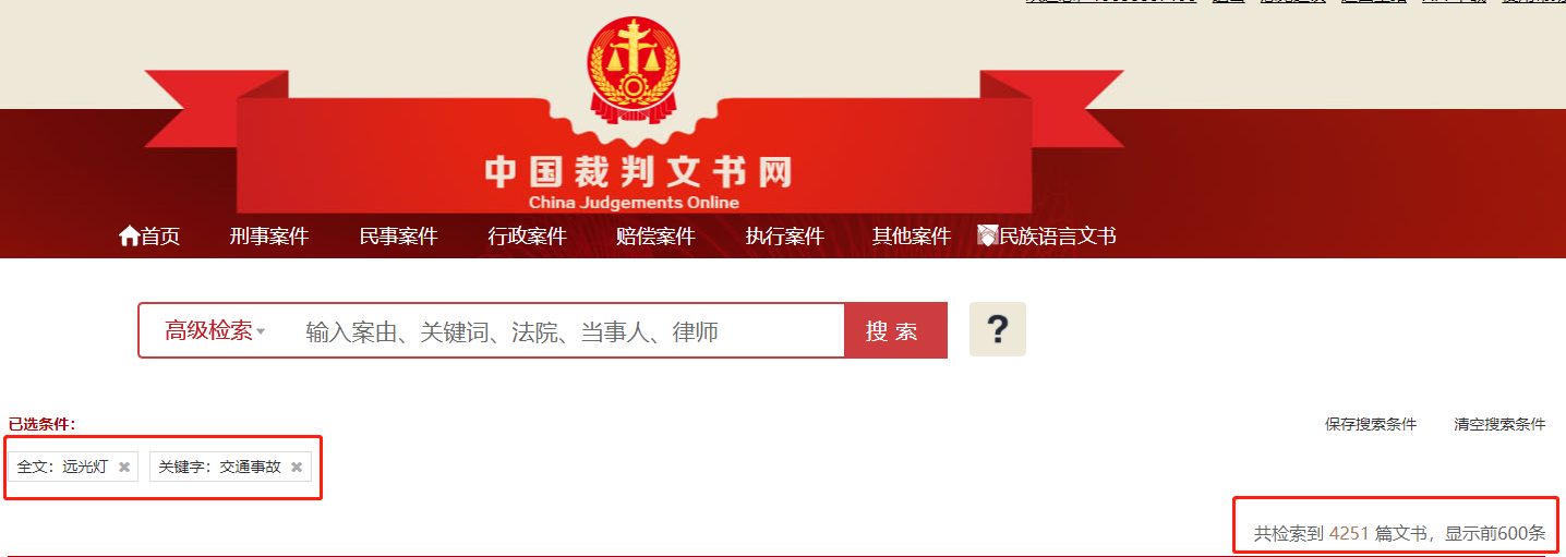 在中国裁判文书网搜索,法院判决文件中,与远光灯相关的交通事故诉讼有4千多条。